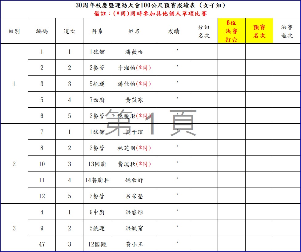 請留意100公尺女生跑道有調整